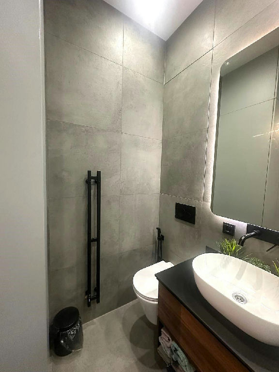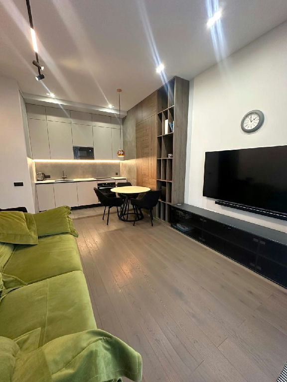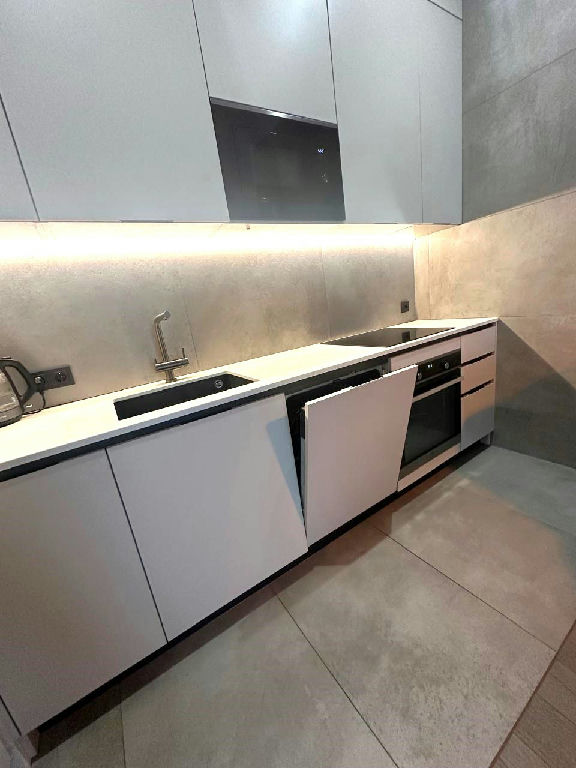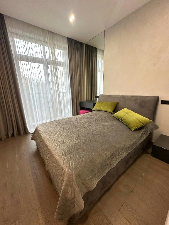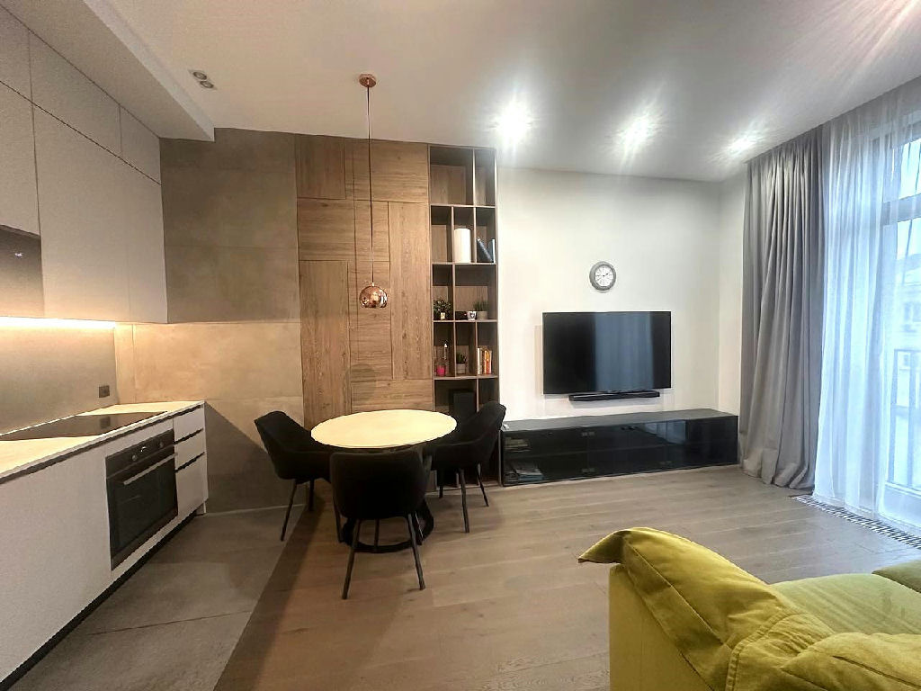 Дорогая встроенная кухня с техникой, полы инженерная доска + керамогранит, в спальне роскошная кровать с ортопедическим матрасом, стильная гостиная с видом в зеленый закрытый двор-сквер, стильный санузел с премиальной сантехникой и стиральной машинкой.